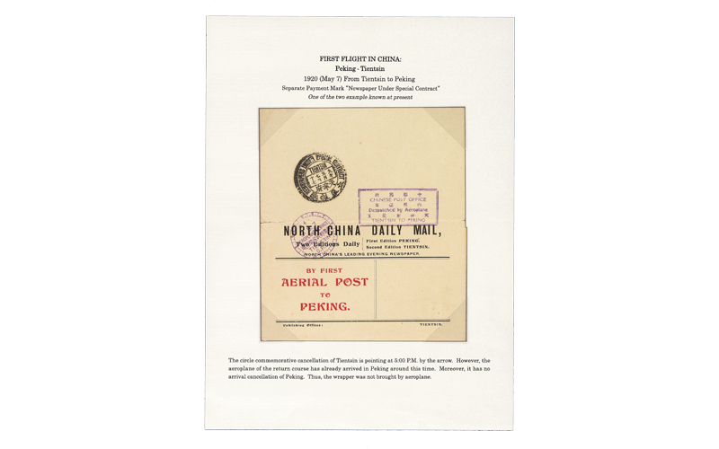 FFC 1920年天津《華北每日郵報》寄北京新聞紙首航封,蓋“天津府 九年五月七日 立券報紙”英中文戳,另蓋藍(lán)色“中華郵政飛艇寄遞 TIENTSIN C.P.O 午後 9.5.7”首航紀念戳,同時(shí)加蓋“中華郵政 由飛艇寄天津至北京”長方形中英文指示戳,信封印刷“BY FIRST AERIAL POST TO PEKING.”紀念文字,存世僅四件,甚罕