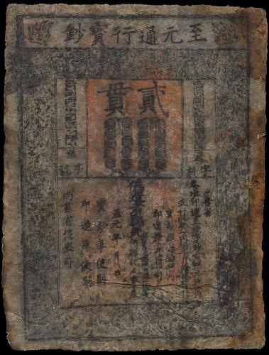 Yuan Dynasty, Zhi Yuan Pao Chao, 2 Guan, Extremely Rare, F