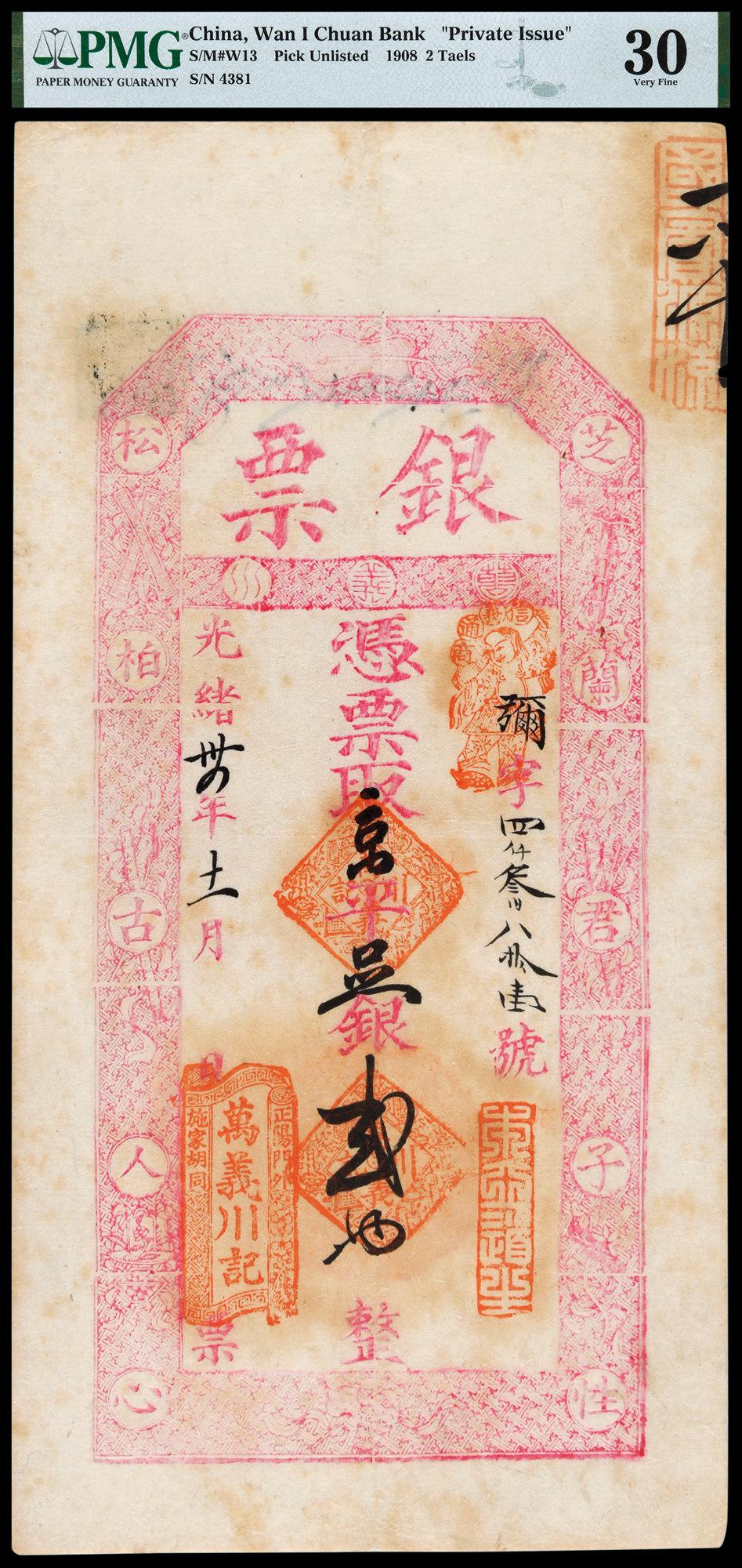1908, Wan Yi Chuan Bank, 2 Taels, Rare, PMG 30