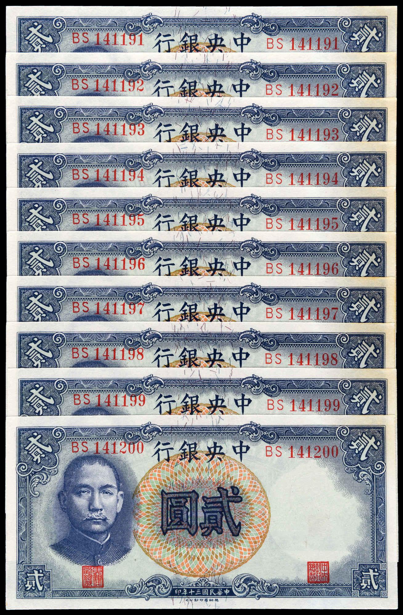1941, The Central Bank of China, 2 Yuan, Total 10 pcs., Consecutive Numbers, AU