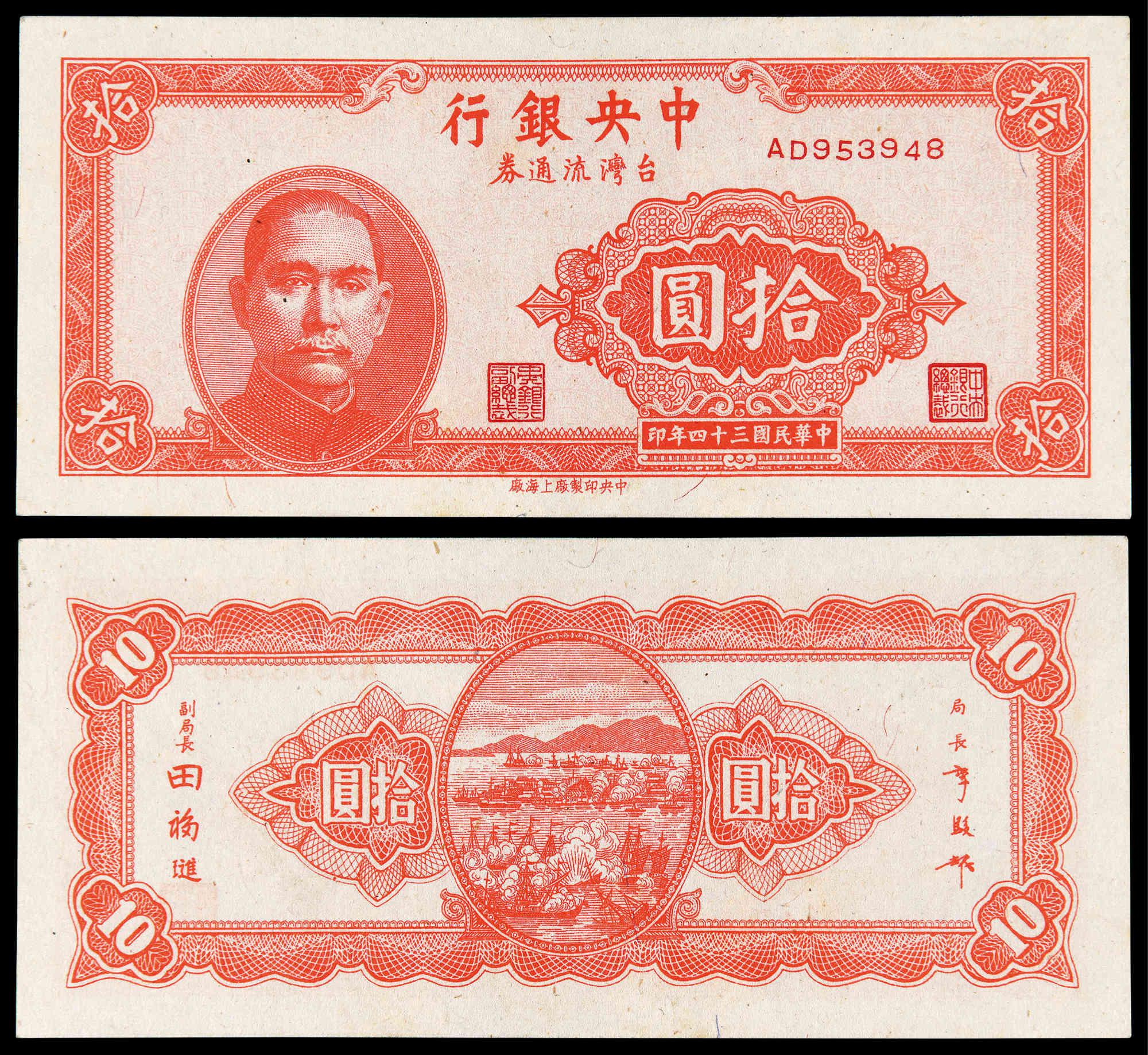 1945, The Central Bank of China, 10 Yuan, Taiwan, Rare, AU