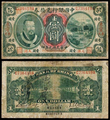 1912, Bank of China, 1 Yuan, Mukden, Rare, VF