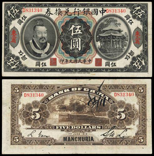 1912, Bank of China, 5 Yuan, Manchuria, Rare, XF