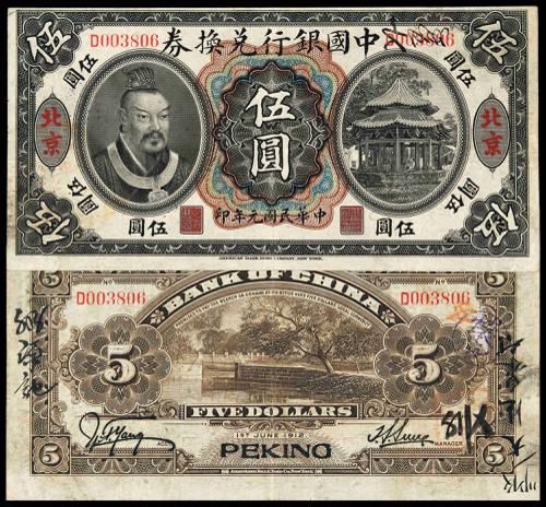 1912, Bank of China, 5 Yuan, Peking, Rare, XF