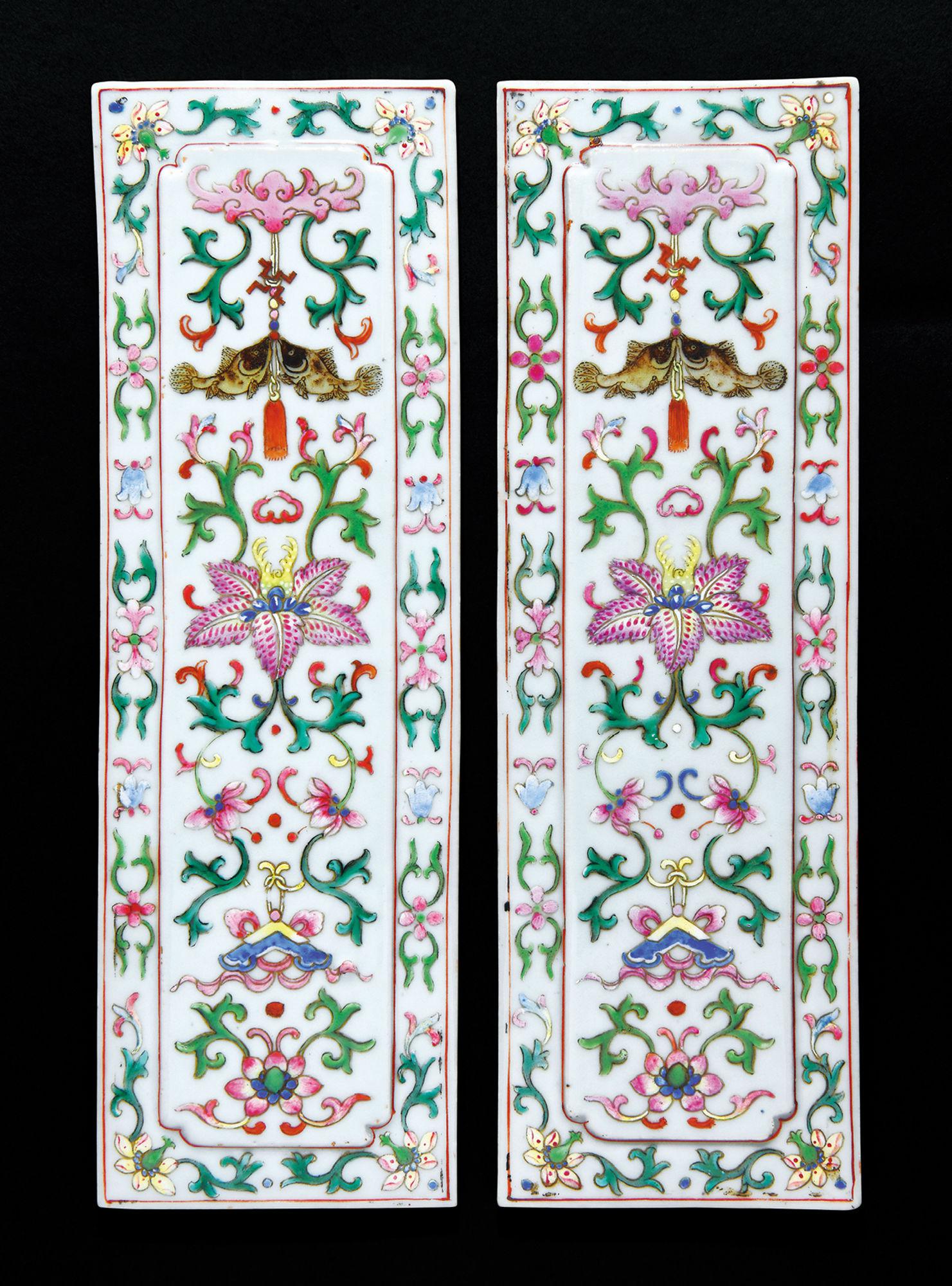 A FINE PAIR OF FAMILLE ROSE CERAMIC PANELS