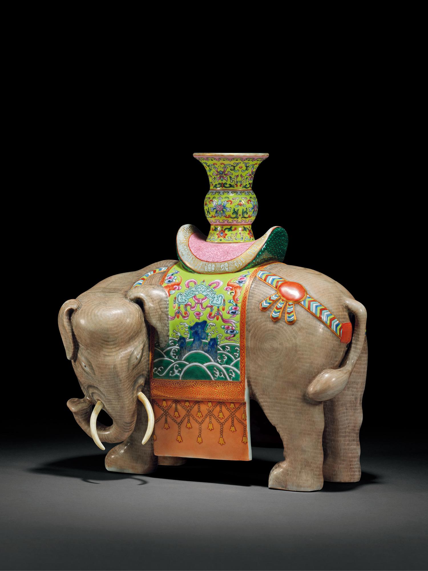 A FAMILLE ROSE ELEPHANT SHAPED FLOWER HOLDER