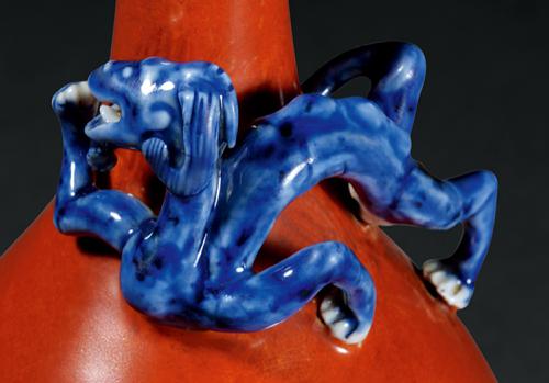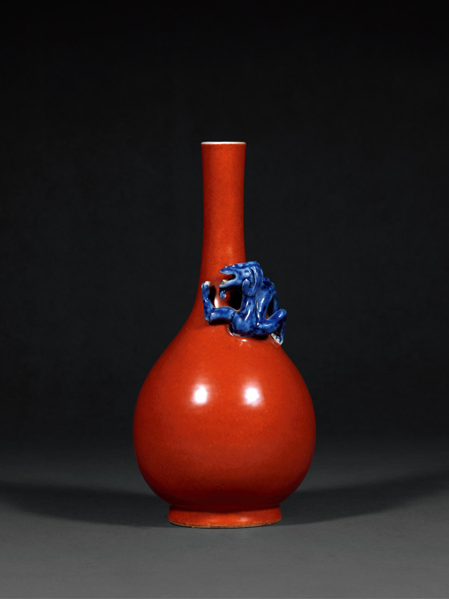 A FINE CORAL RED VASE WITH A FREESTANDING BLUE AND WHITE CHILONG