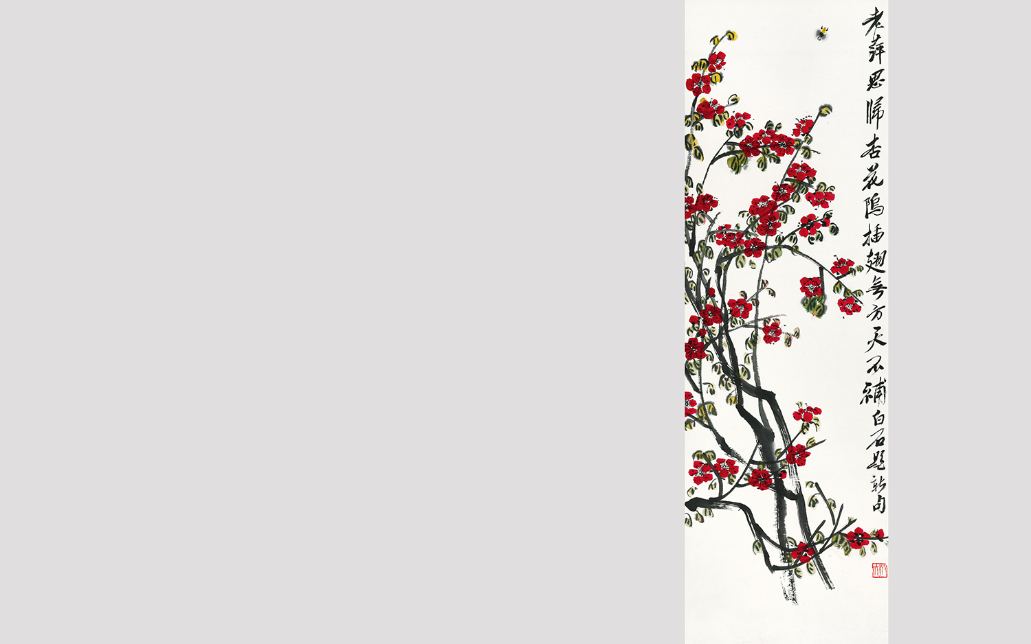 《紅杏蜜蜂》未署年款,依畫(huà)面風格和(hé)款字判斷為(wèi)1940年代前期作(zuò)品,是齊氏“紅花(huā)綠葉”之佳制(zhì)。 在齊白石的花(huā)卉題材中,杏花(huā)是數(shù)量較少(shǎo)的一種,但(dàn)是杏花(huā)對畫(huà)家(jiā)卻有(yǒu)非凡的意義,一則由于杏花(huā)使他名揚海外,備受日人(rén)關注,他曾寫道(dào)“陳師(shī)曾壬戌春往日本,代餘賣杏花(huā)等畫(huà),每幅百金”,比齊氏在國內(nèi)的潤金高(gāo)出許多(duō);更深層次的原因是杏花(huā)為(wèi)白石老人(rén)鄉思的寄托,他出生(shēng)的星塘老屋,就坐(zuò)落于杏子塢之畔,他曾題畫(huà)曰“星塘老屋在杏子塢之南”,并自署“杏子塢老民”,杏子塢即杏花(huā)村,齊氏也有(yǒu)詩曰“星塘一帶杏花(huā)風,黃犢出欄西複東”,本幅又題“老萍思歸杏花(huā)塢”,可(kě)見齊白石對杏花(huā)記憶之深刻、情感之濃厚。 在齊白石早期的杏花(huā)作(zuò)品中,枝幹追求木雕般的硬朗風格,“衰年變法”之後,造型更為(wèi)生(shēng)動。《紅杏蜜蜂》取豎幅構圖,枝幹從畫(huà)面底部和(hé)左側探入,枝杈施以篆書(shū)書(shū)法,蒼勁古拙且富有(yǒu)行(xíng)筆變化,橫向與縱向的線條互有(yǒu)穿插,整體(tǐ)走勢并非直上(shàng)直下,而是呈弧型,在穩定畫(huà)面之餘,更有(yǒu)延伸、引導視(shì)線的作(zuò)用。綠色的葉片自枝上(shàng)生(shēng)發,物象概括凝練。繁密的杏花(huā)以洋紅繪就,複以墨點蕊,白石老人(rén)在部分作(zuò)品中有(yǒu)意以濃淡色的變化來(lái)表現花(huā)朵的嬌豔,但(dàn)在本幅他一反常規,使用濃重的洋紅畫(huà)花(huā),意在最大(dà)限度地展現花(huā)卉之精神。右上(shàng)方一隻蜜蜂被花(huā)香吸引,振翅飛來(lái),動靜相對,右側一炷香式的題字封住空(kōng)間(jiān),構圖圓滿完整。