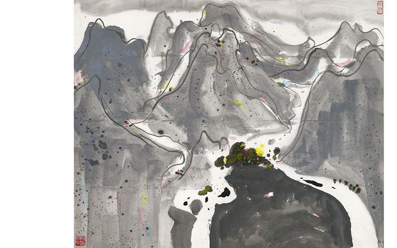 吳冠中曾于1973年、1983年兩度赴黃山(shān)寫生(shēng),縱觀現存資料,他以黃山(shān)入畫(huà)的作(zuò)品數(shù)量并不多(duō),主要在八十年代,有(yǒu)彩墨及油畫(huà)《黃山(shān)日出》《黃山(shān)松》《黃山(shān)人(rén)字瀑》等,選取最具表現力的黃山(shān)景點,歸納、提煉于畫(huà)中,各具形式之美,為(wèi)其藝術(shù)理(lǐ)念的有(yǒu)力體(tǐ)現。 此幅《黃山(shān)人(rén)字瀑》即為(wèi)一例,約作(zuò)于上(shàng)世紀八十年代中期。畫(huà)中以簡練而準确的長線條勾勒山(shān)巒輪廓,着意于起伏之勢,撲面而來(lái)的近山(shān)遠峰,層層疊疊,有(yǒu)西畫(huà)的透視(shì)感,又合乎傳統中國畫(huà)論中的深遠。灰墨大(dà)筆掃擦出山(shān)體(tǐ),凸顯其體(tǐ)勢氣魄。水(shuǐ)口以重墨表現,留白的瀑流分途奔湧,呈“人(rén)”字狀,呈現最顯著的地貌特征。整個(gè)畫(huà)面由點線面構成,形成黑(hēi)白灰的對比,斑斓的色點躍動其間(jiān),構造出畫(huà)家(jiā)心目中的形式美。