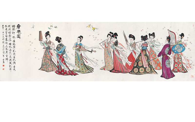 劉旦宅自幼年便顯露出非凡的繪畫(huà)天分,少(shǎo)時(shí)喜摹古典題材及曆史人(rén)物版畫(huà),這一傾向成為(wèi)其後期主要創作(zuò)題材之發端。縱覽劉氏畫(huà)作(zuò),不難發現他對古典人(rén)物獨特的情結,所作(zuò)名賢文士、麗(lì)姝淑媛皆能準确把握其性情、心理(lǐ)和(hé)瞬間(jiān)神态,恰如論者所言“所繪才賢武士美女高(gāo)人(rén),各具風韻并于神貌之中各顯性格,蓋探赜鈎沉故能精微入玄而非優孟之似也。”其所繪人(rén)物造型以清秀俊逸、風神疏朗,亦古亦今,“空(kōng)清而絕去渣滓”,在近代畫(huà)壇獨标一格。 是幅《唐樂》作(zuò)于1980年,尺幅逾二十六平尺,為(wèi)畫(huà)家(jiā)古典仕女題材之巨制(zhì)。繪十位唐裝女子吹彈奏樂之場(chǎng)景。右數(shù)第一位單髻紮花(huā),身着綠襦紅帛印花(huā)裙,纖手彈撥豎箜篌,器(qì)身上(shàng)飾鳳首,下墜紅纓。第二位女子身着男裝,為(wèi)唐代宮廷流行(xíng)裝束,頭戴幞頭,身穿窄袖紫襕袍,衣背上(shàng)下各綴紫靛二色花(huā)卉紋補子,雙手斜執一柄藍(lán)底雙鳳儀仗長扇。第三、四位少(shǎo)女皆系雙髻,相顧吹奏橫笛,體(tǐ)态婀娜作(zuò)舞動之姿。第五位着紅花(huā)紋半臂襦裙,颔首吹笙。第六、七位女子吹箫。第八、九位分别彈奏琵琶、阮鹹,前者着藍(lán)襦綠花(huā)裙,素帶飄舉,手持撥子橫彈曲頸四弦琵琶,姿态頗似唐代佛教絹畫(huà)《熾盛光佛并五星圖》中持曲頸琵琶之金星;後者背立,着鳳紋藍(lán)襦紅底花(huā)裙,橫抱阮鹹與前者相顧。第十位女子梳高(gāo)髻,于隊首以拍闆擊節而和(hé),姿态與出自敦煌的五代絹本《飛天像長幡》相似。 通(tōng)幅人(rén)物造型精美,衣飾器(qì)物考究,十位盛裝仕女均神采煥發,儀态優美端莊,冶而不媚,悠然緩步于畫(huà)幅之上(shàng),演奏、舞動,人(rén)物之間(jiān)的過渡承接巧妙自然,互有(yǒu)呼應。女子周身皆衣袂飄拂,又有(yǒu)粉色櫻花(huā)散落其間(jiān),引來(lái)燕雀黃鹂騰空(kōng)飛翔,随樂啼鳴,呈現出一派繁弦急管、莺歌(gē)燕舞之佳景。