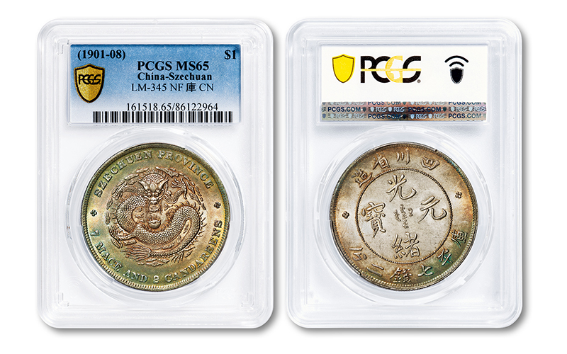 1901年四川省造光緒元寶庫平七錢(qián)二分銀币一枚,Y-238/LM-345,四角龍點邊須混雲無刺版;四川龍銀因鋼模制(zhì)作(zuò)工藝欠精,壓印數(shù)量巨大(dà),模具旋修旋壞,故後世所見版式衆多(duō),且大(dà)部分有(yǒu)先天弱打或後天磨損,品相完美無瑕者十分罕見;拍品系鋼模初打,版底細膩,字口峭立,蟠龍頭角飽滿,鱗甲鋒刃,不僅先天鑄打拔萃超群,後天包漿自然至美,銀光斑斓絢麗(lì),具有(yǒu)強烈的視(shì)覺美感,絕美狀态當為(wèi)川龍愛(ài)好者夢寐以求,PCGS MS65,為(wèi)目前該公司評級紀錄冠軍分