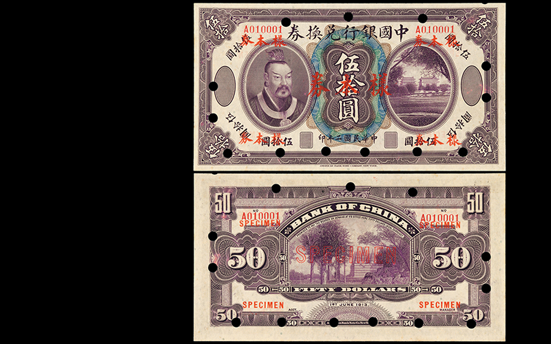民國二年黃帝像中國銀行(xíng)兌換券伍拾圓流通(tōng)票(piào)加蓋改作(zuò)樣票(piào)一枚,票(piào)面加蓋“樣本券”及“SPECIMEN”字樣并打孔,未發行(xíng),存世僅見極少(shǎo)樣票(piào),《中國曆代貨币大(dà)系》将其珍罕度列為(wèi)四顆星;樣票(piào)不僅品種珍罕,印工精美,直版無折,票(piào)面整潔,墨色飽滿鮮豔,保存狀态幾近完美,堪稱中國銀行(xíng)紙币頂級珍品,可(kě)遇而不可(kě)求,九二成新 民國肇始,中國銀行(xíng)委托美國鈔票(piào)公司設計(jì)印制(zhì)黃帝像兌換券壹圓、伍圓、拾圓三種,加蓋北京、上(shàng)海、天津、漢口等二十餘省地名,于各地陸續發行(xíng)。翌年再次由美鈔公司印制(zhì)了壹圓、伍圓、貳拾圓、伍拾圓、壹百圓五種面額的兌換券,準備陸續發行(xíng)流通(tōng),但(dàn)地名減少(shǎo)至廣東、山(shān)東、福建等少(shǎo)數(shù)省市。彼時(shí)地方銀行(xíng)濫發紙币之勢更甚于清末,堪稱中國貨币史最為(wèi)混亂的時(shí)期。1914年3月,北洋政府着手整頓币制(zhì),籌備發行(xíng)全國統一貨币,黃帝像兌換券旋即停發,其中,貳拾圓、伍拾圓、壹百圓三種高(gāo)面額票(piào)均未正式流通(tōng),存世僅有(yǒu)少(shǎo)數(shù)樣票(piào),是中國近代貨币發行(xíng)史的寶貴實物史料。