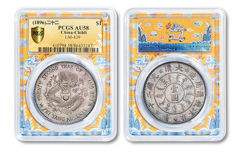 光緒二十二年北洋機器(qì)局造壹圓銀币一枚,Y-65/LM-439,是中國最早以“圓”為(wèi)币值的流通(tōng)銀币,鑄行(xíng)時(shí)間(jiān)短(duǎn)暫,存世極為(wèi)稀少(shǎo);拍品鋼模初打,重壓之下底版細膩絲滑,鏡面感強烈,其上(shàng)滿漢文字峻拔分明(míng),背龍圖須發絲縷畢現,鱗片豐潤飽滿,完好底版無版裂、無戳印,折射出的紫羅蘭色彩光,賞心悅目,宛俱樣币風範;作(zuò)為(wèi)北洋系列流通(tōng)币最為(wèi)珍罕的名品,如此保存狀态可(kě)謂難能可(kě)貴,必将受到實力藏家(jiā)的高(gāo)度關注,珍罕之至,征集自國內(nèi)資深藏家(jiā),PCGS AU58