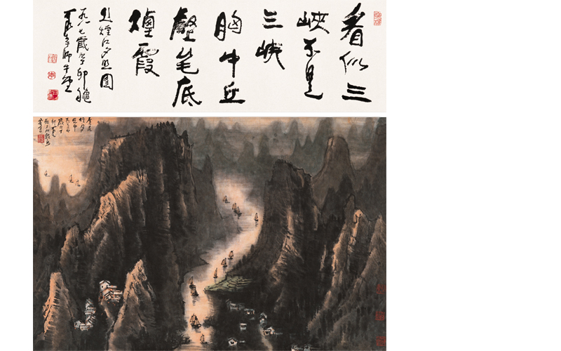 詩堂:看似三峽,不是三峽。胸中丘壑,筆底煙霞。題煙江夕照圖。一九八七歲次丁卯秋,可(kě)染于師(shī)牛堂。
