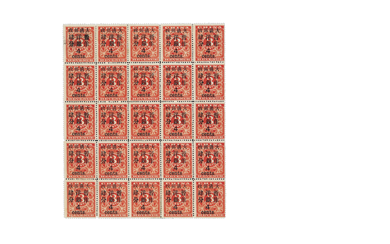 ★ 1897年紅印花(huā)加蓋暫作(zuò)郵票(piào)大(dà)字4分二十五枚全格,位?全張左下之第三全格,左上(shàng)一枚加蓋墨色較濃,色彩鮮豔,保存極好,原膠貼紙,上(shàng)品