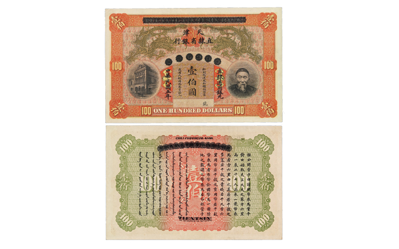 民國五年李鴻章像北洋天津銀号改天津直隸省銀行(xíng)銀元票(piào)壹佰圓樣票(piào)一枚,另蓋“中華民國五年直隸通(tōng)用銀元”,未加蓋号碼及樣票(piào)字樣,未打孔,此壹佰圓未加蓋原票(piào)已屈指可(kě)數(shù),加蓋改天津直隸省銀行(xíng)券則更為(wèi)罕見,品相極佳,全新