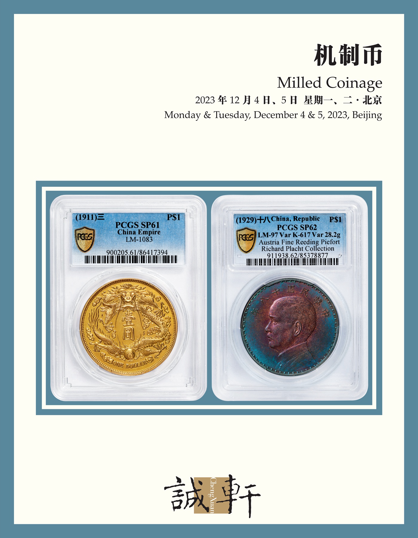 宣統三年大(dà)清銀币“立龍”伍角樣币一枚,Y-30/LM-39,1911年度支部造币總廠試鑄,未發行(xíng),鑄額稀薄;樣币鑄工卓越,內(nèi)齒銳利,龍鱗鋒刃,輕薄原味包漿之下,底版細膩亮澤,銀光充沛,實為(wèi)此一品種品相之佼佼者,殊為(wèi)難得(de),PCGS SP64+,目前為(wèi)該公司評級紀錄亞軍分 “宣三”大(dà)清銀币系列在制(zhì)定之時(shí)包括伍角、貳角、壹角三種十進制(zhì)銀輔币,銘文分别注明(míng)二枚、五枚、十枚換一圓。背面圖案為(wèi)“立龍”,龍珠位于左上(shàng)角而非中央或下方,此種設計(jì)在龍銀中非常罕見。因新币發行(xíng)的慣例是主币先行(xíng),故計(jì)劃在新壹圓國币通(tōng)行(xíng)後再跟進,但(dàn)辛亥革命的突然爆發使銀輔币沒有(yǒu)批量生(shēng)産。在數(shù)量不多(duō)的銀輔币中,以伍角最為(wèi)稀少(shǎo),從其雕刻風格來(lái)看,雕刻師(shī)應為(wèi)曲須龍作(zuò)者喬治,貳角及壹角龍面的雕刻者應為(wèi)餘子貞。—摘自孫浩編著《百年銀圓》,上(shàng)海科學技(jì)術(shù)出版社,2012年,頁113。