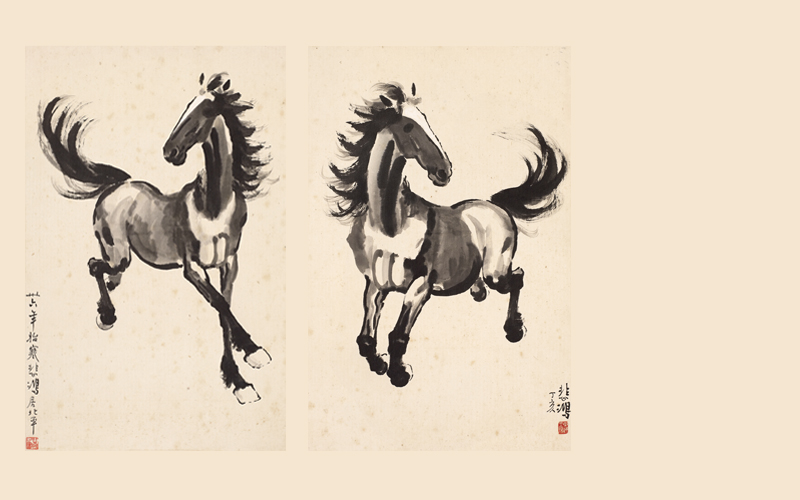 徐悲鴻筆下,以水(shuǐ)墨大(dà)寫意的方法畫(huà)馬,突破了細線勾畫(huà)輪廓、再加以暈染的傳統畫(huà)馬窠臼,将畫(huà)馬藝術(shù)提高(gāo)到“一洗凡馬萬古空(kōng)”的藝術(shù)境界。