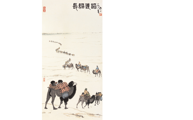 畫(huà)作(zuò)描繪沙漠駝群,之字形蜿蜒遠方的駱駝隊,昂揚挺拔前行(xíng)的身影(yǐng),襯以空(kōng)闊遼遠的沙漠,以畫(huà)家(jiā)親身體(tǐ)驗寫出,益發顯出其不凡的襟懷與氣象,令人(rén)悠然而有(yǒu)心遊大(dà)荒之思。