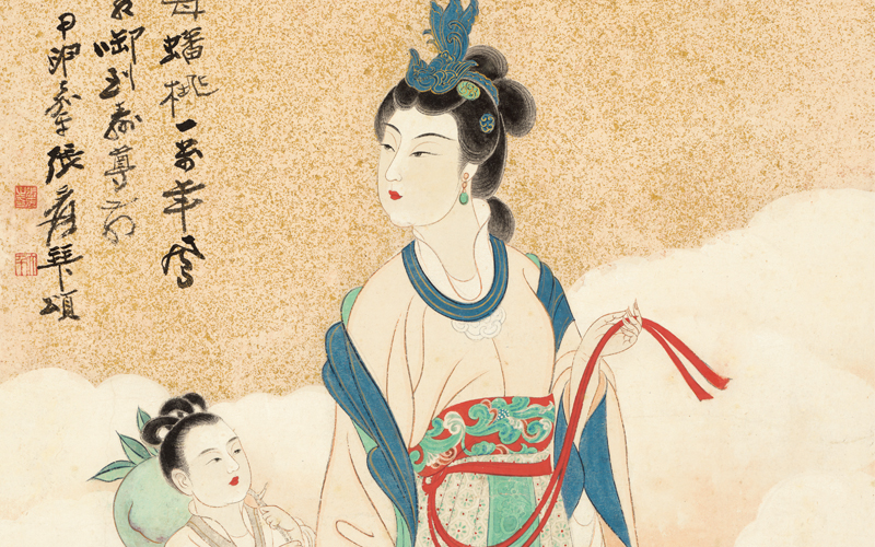 題識:1.蓬萊弱水(shuǐ)三千裏,金母蟠桃一萬年。鳳鳥自歌(gē)鸾自舞,直教啣到壽尊前。蕭母林太夫人(rén)六十大(dà)慶。甲申嘉平,張爰拜頌。