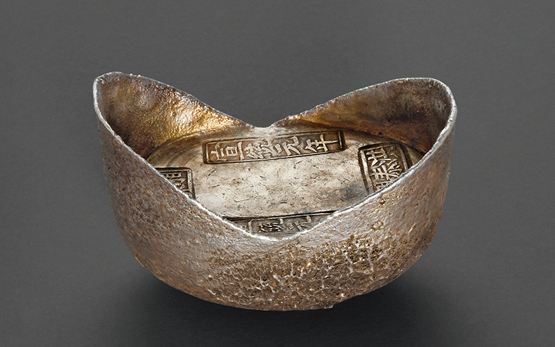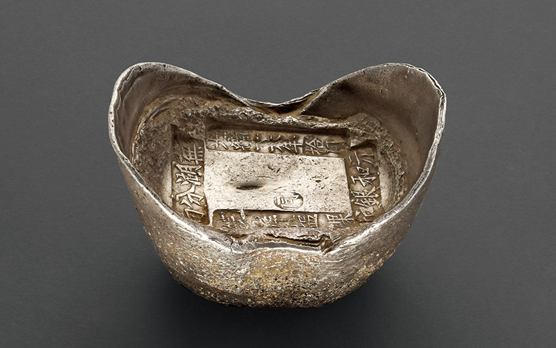 清代湖(hú)南“宣統元年 宣統元年 湘省包介 洪泰興”五十兩銀錠一枚,重量:1871.5克;湖(hú)南五十兩大(dà)寶由各府州縣上(shàng)解的各類稅收銀兩傾鑄而成,其造型獨特,雙翼低(dī)矮,面呈圓弧狀,底部為(wèi)較寬闊的橢圓形,狀似龜殼,民間(jiān)習稱“龜寶”,存世稀少(shǎo),是五十兩大(dà)寶中的人(rén)氣品種